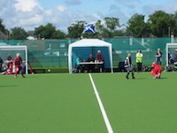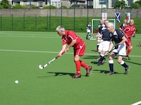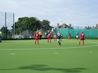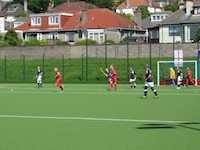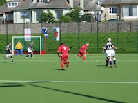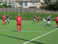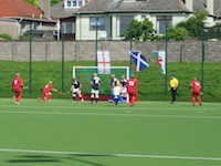 Ballard passes to Sheikh with Ballingall blocking his way into the Scottish circle