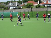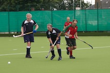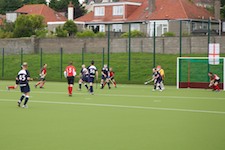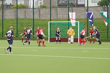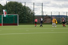 Loudon about to make a saving interception from Gangotra's cross with two Welsh players waiting to pounce