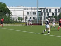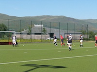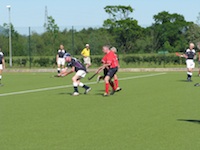 Ernie di Rollo once again leads out the Scottish defence at a short corner with the ball on its way to the striker