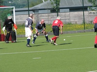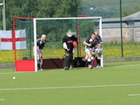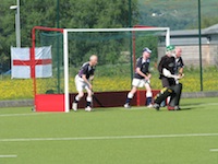 Scottish captain David Cassell keeps his eye on the ball with English forward Frank Hardy in close attendance