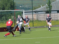 Terry Howlett fires the ball past Scotland keeper Ron Fraser to score for England