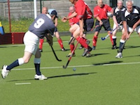 Evasive action from an England defender as Rab Keddie fires the ball into the circle towards waiting Scottish players Don Paterson and Matt Aird