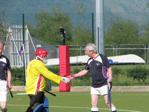 Caption: England goalkeeper Alan Dures shakes hands with Don Paterson at the end of the game