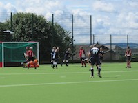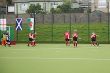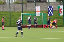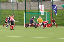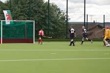 Loudon about to make a saving interception from Gangotra's cross with two Welsh players waiting to pounce